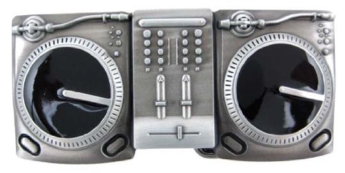 This cool gunmetal finish DJ dual turntable and mixer belt buckle features black enamel "records" on each turntable. The buckle measures 4 1/4 inches wide, is 2 inches tall, and has a back loop that can accommodate a snap belt up to 1 1/2 inches wide.This buckle is made of high quality materials to give you years of wear.
